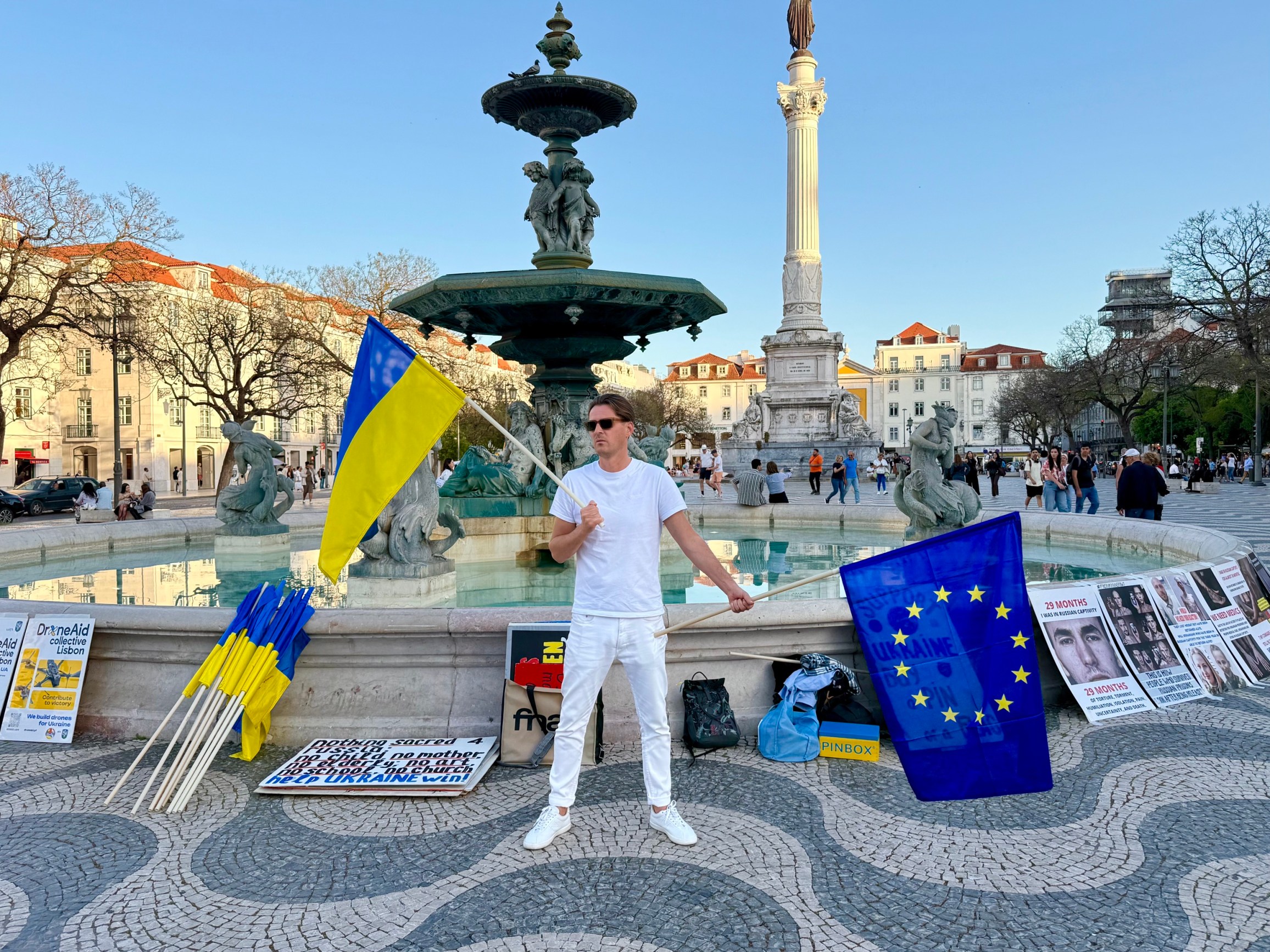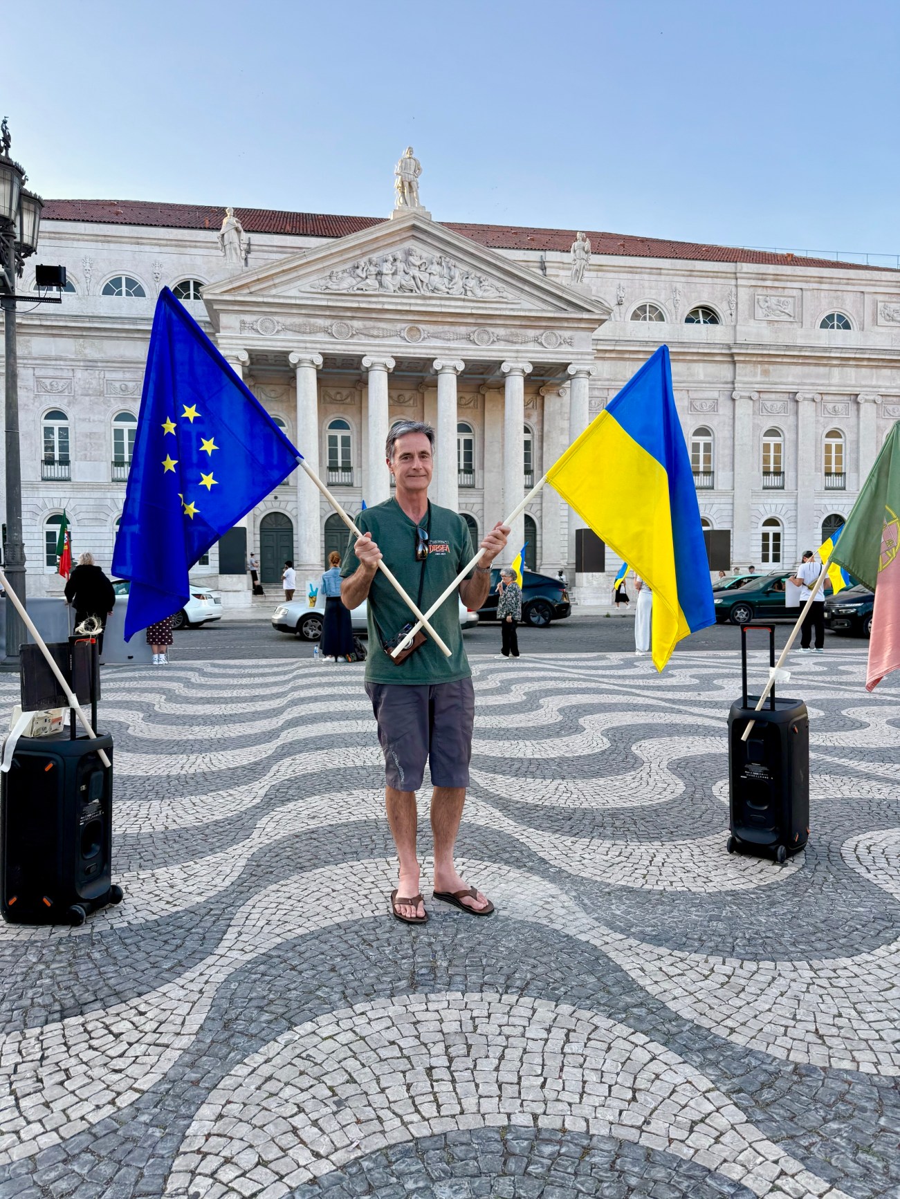 I met a number of Ukrainians playing music, singing songs and asking for peoples’ help in their war agait Russian aggression. uper nice and grateful for my help there four years ago. One, Roman, asked me to hold the flags he was carrying after I asked to photograph him. Great guy who’s completely heartbroken about the war.