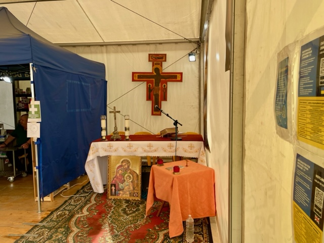 A makeshift border church. Religion provides tremendous solace and a way to deal with everything that these people are experiencing.